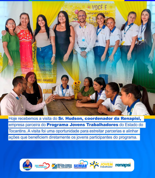 A Secretaria Municipal de Assistência Social recebeu a visita do Sr. Hudson, coordenador da RENAPISI, empresa parceira do Programa Jovem Aprendiz do Estado do Tocantins.