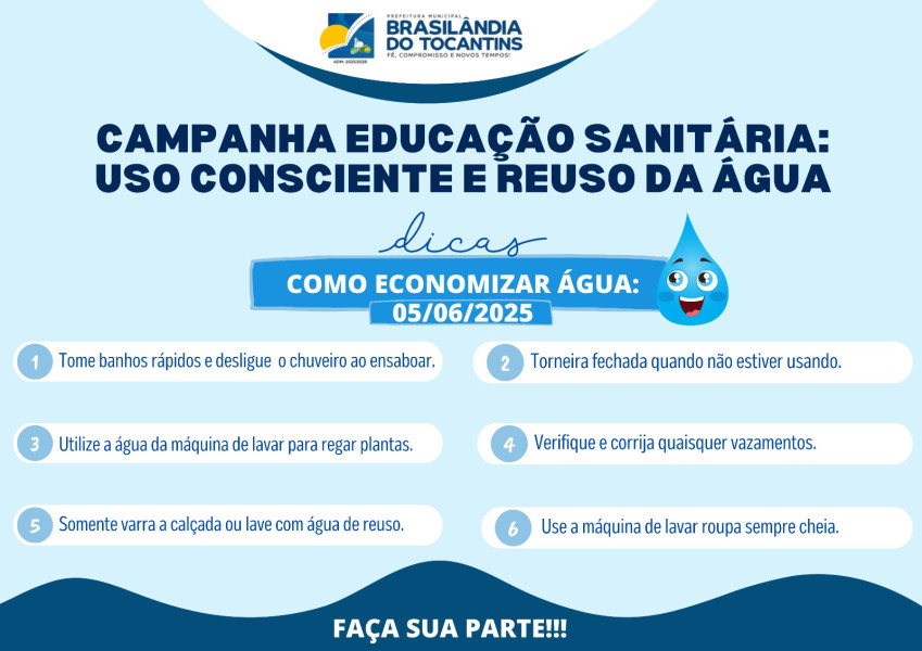 0 5 de junho de 2025 , em comemoração à Semana do Meio Ambiente, a Prefeitura lançou a Campanha Sanitária: Uso Consciente e Reúso da Água , reforçando a importância de preservar este recurso essencial para a vida e para o equilíbrio dos ecossistemas.