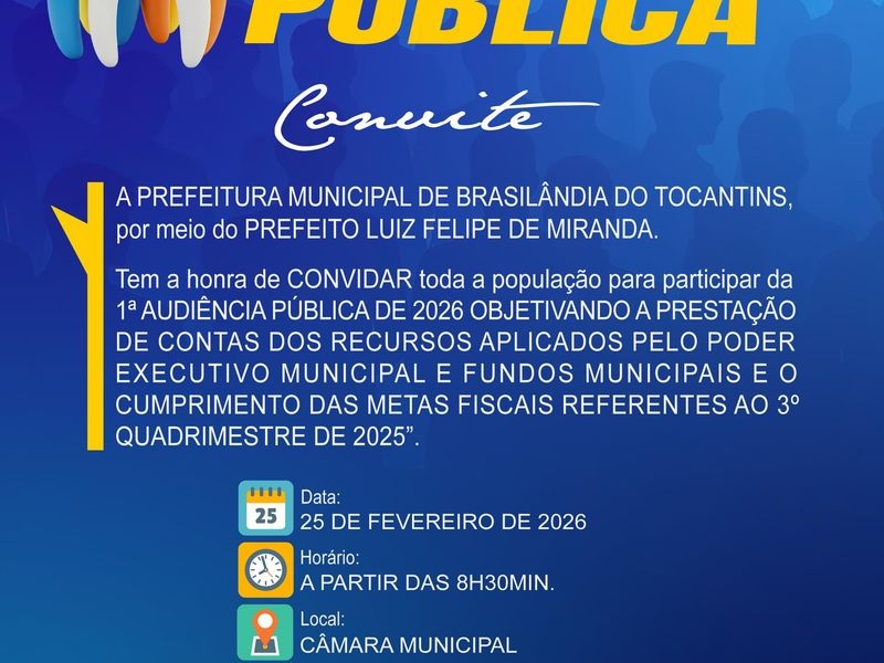 A Prefeitura Municipal de Brasilândia do Tocantins, sob a gestão do Prefeito Luiz Felipe de Miranda, convida toda a população para participar da 1ª Audiência Pública de 2026. O evento visa apresentar a prestação de contas detalhada dos recursos aplicados pelo Poder Executivo Municipal e pelos Fundos Municipais, além de discutir o cumprimento das metas fiscais referentes ao 3º quadrimestre de 2025.